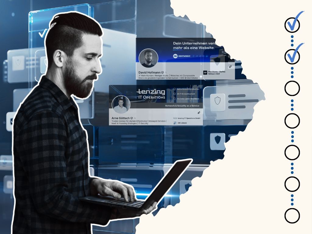 Im Profil-Check schauen wir uns (Sebastian & Michael) gemeinsam mit dir dein Profil an und finden heraus, wo du aktuell mit deinem Personalbrand stehst. Basierend darauf geben wir dir eine ehrliche Einschätzung, welcher Weg auf LinkedIn für dich funktionieren kann und welche Optimierungen du im Profil direkt anwenden kannst.