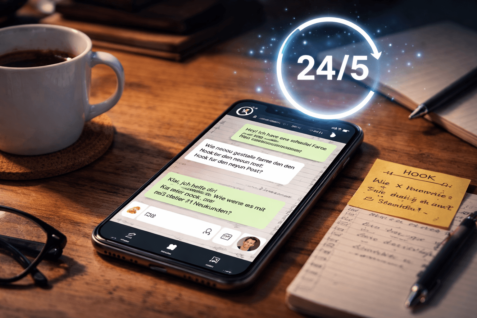 Wir sind 24/5 über WhatsApp für dich erreichbar, damit Fragen zwischen den wöchentlichen Calls zeitnah geklärt werden und du in die Umsetzung kommst.